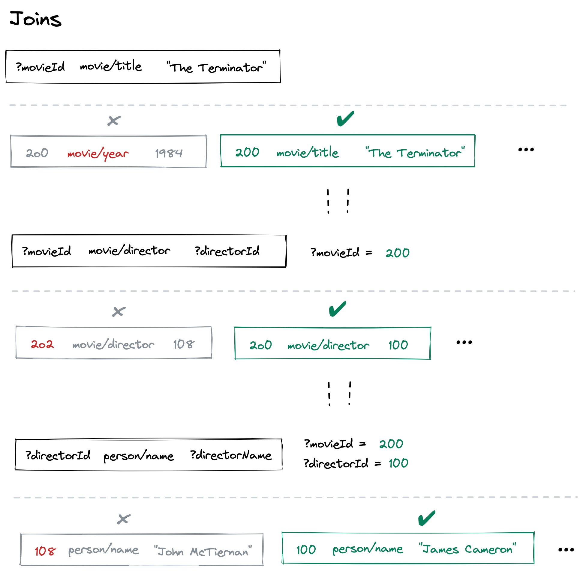 Our query engine runs through triple after triple. Since ?id can be anything, this matches every triple. But, the attribute movie/year and the value 1987 filter us down to just the triples we care about: